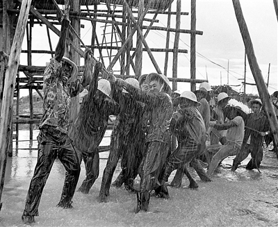这是1973年,中国、坦桑尼亚、赞比亚工人、技术人员在一起冒雨赶修坦赞铁路。新华社记者 李生南 摄