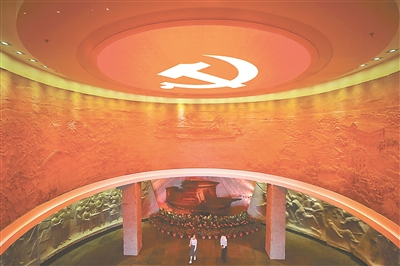 下图:浙江嘉兴南湖革命纪念馆内,序厅穹顶上的党徽分外醒目。(资料图片)
