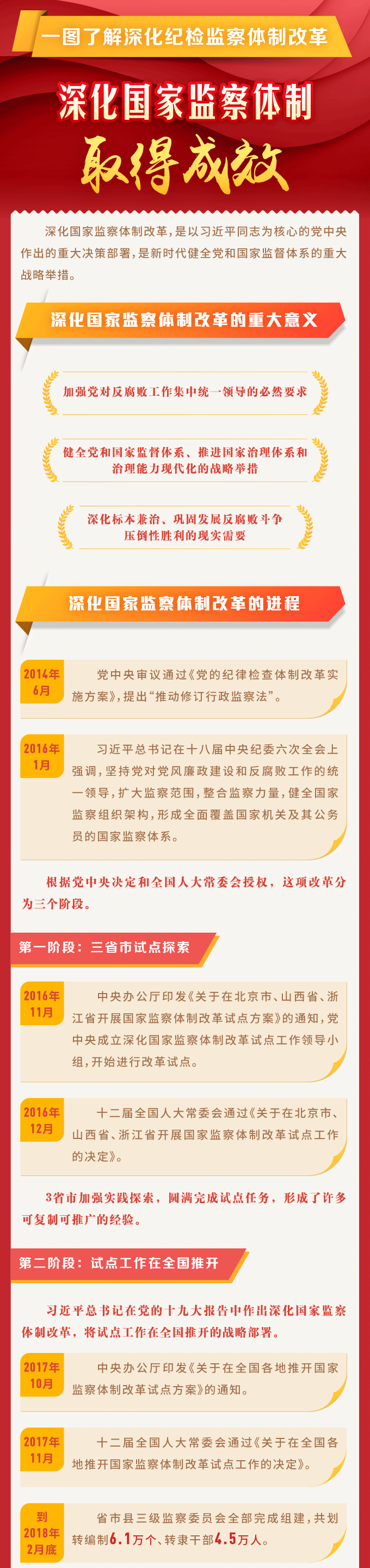 一个月后,国家、省、市、县四级监察委员会全部组建产生,实行党的纪律检查委员会、监察委员会合署办公,完成人员转隶,共划转编制6.1万个、转隶干部4.5万人。