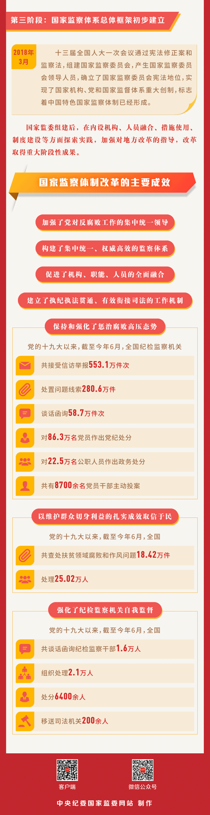 十三届全国人大一次会议通过宪法修正案和监察法,组建国家监察委员会,产生国家监察委员会领导人员,标志着国家监察体制改革取得重大成果。通过国家监察体制改革,有效解决了过去监察范围过窄、反腐败力量分散、纪法衔接不畅等问题,有利于加强党对反腐败工作的集中统一领导,有利于实现对公权力监督的全覆盖,有利于坚持标本兼治、巩固扩大反腐败斗争成果。党的十九大以来,截至今年6月,全国纪检监察机关共接受信访举报553.1万件次,处置问题线索280.6万件,谈话函询58.7万件次,对86.3万名党员作出党纪处分,对22.5万名公职人员作出政务处分,8700余名党员干部主动投案。