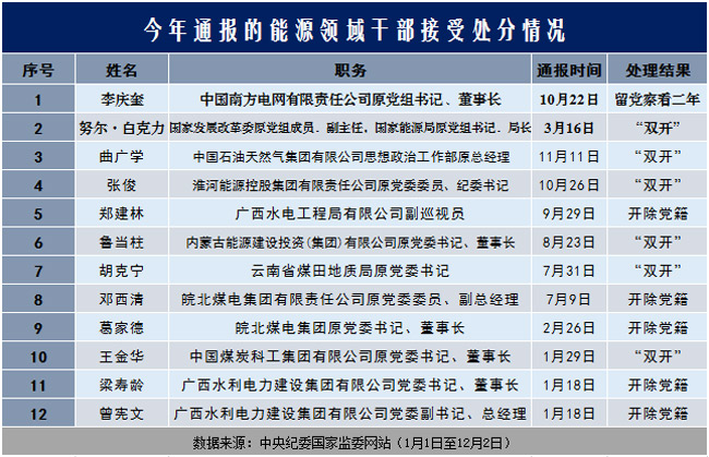 梳理中央纪委国家监委网站审查调查栏目,今年以来,包括煤炭、石油、电力在内的能源领域至少已有22人接受审查调查,12人受到党纪政务处分,能源等资源富集行业和重点领域腐败多发,必须突出重点、精准惩治,加大以案促改,实现标本兼治。