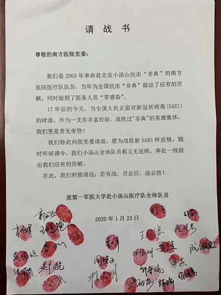 “我们是2003年奉命赴北京小汤山抗击‘非典’的南方医院医疗队队员,当年为全国抗击‘非典’做出了应有的贡献,同时做到了医务人员‘零感染’。17年后的今天,当全国人民正面对新冠状病毒(SARI)的肆虐,作为一支有丰富经验、战胜过‘非典’的英雄集体,我们更是责无旁贷!”1月23日,一张满是红手印的请战书在微博上引发关注,“若有战,召必回,战必胜”,来自南方医院原第一军医大学赴小汤山医疗队的全体队员的宣言,感动了无数网民。