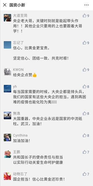 “国资小新”运营团队一位工作人员说,抗击疫情,央企在行动,小新也在行动,我们不仅守护14亿人共同的家底,更守护14亿人的生命健康。