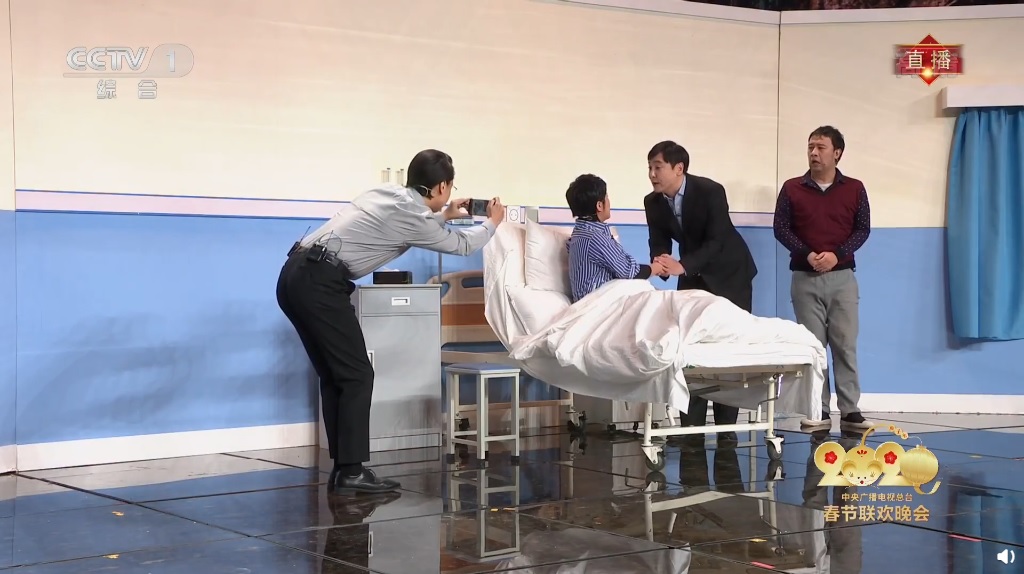小品中,正在给下属演示如何装病的马主任,碰到了前来慰问的郝科长,一系列情节冲突就此展开。特定的肢体语言和表情、固定角度摆拍、逢场作戏的问答、剪辑“素材”……关于慰问的一个个“套路”相继呈现在观众面前。