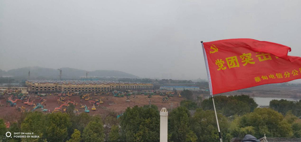 除夕当天,中国电信武汉分公司党员先锋队冒雨为火神山施工现场管理和工作人员搭建应急通信车。