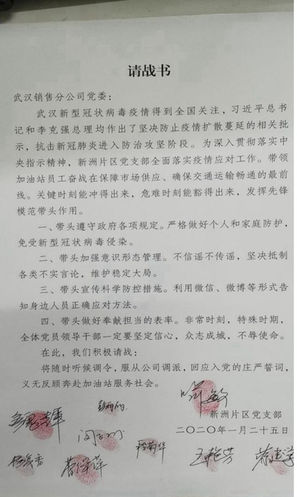 在保障市场供应、确保交通运输畅通的最前线,中石油武汉分公司党委募集党员志愿服务者,随时听候调令,服从公司调派,赴加油站服务。