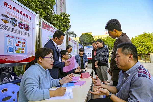 福建省莆田市纪委监委把基层党员干部违反中央八项规定精神、不担当不作为等方面突出问题作为监督检查重点,持续开展专项整治,通过深入基层开展面对面接访、实地走访等方式深挖细查问题线索。图为该市纪检监察干部在华林经济开发区流动接访点接访。摄影/吴震(莆田市纪委监委干部)