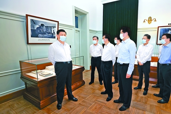 6月25日,中共中央政治局就用好红色资源、赓续红色血脉举行第三十一次集体学习。这次集体学习采取参观和讨论相结合的形式,这是习近平、李克强、栗战书、汪洋、王沪宁、赵乐际、韩正等在北大红楼参观“光辉伟业 红色序章——北大红楼与中国共产党早期北京革命活动主题展”。新华社记者 谢环驰 摄