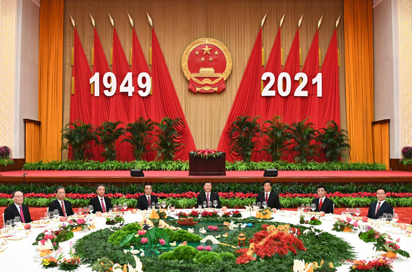 中央党政军群有关部门负责人,各民主党派、全国工商联负责人和无党派人士代表,北京市负责人,功勋荣誉获得者代表、全国“两优一先”表彰对象代表,东京奥运会、残奥会中国体育代表团代表,全国劳动模范和先进人物代表,为民族地区稳定、发展、团结作出重要贡献的少数民族代表人士,在京的部分香港特区人士、澳门特区人士、台湾同胞和华侨、华人代表,各国驻华使节、各国际组织驻华代表、部分外国专家也出席了招待会。