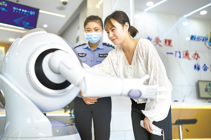 江苏省盐城市公安局亭湖分局东城派出所“盐之e警”综合服务中心,办事群众在智能机器人上了解所办事项内容。(图片来源:视觉中国)