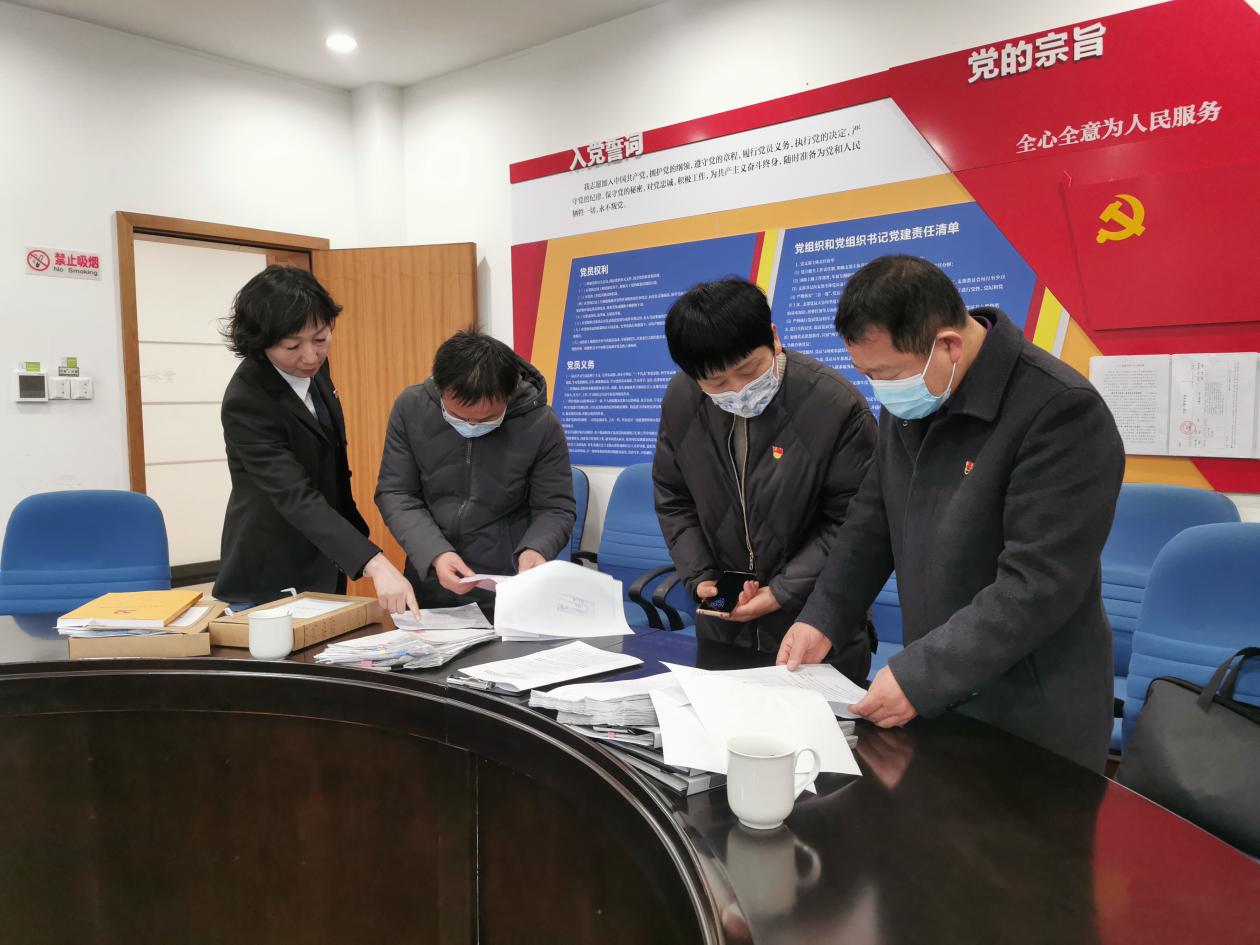 图为检查组翻阅相关文件和台账
