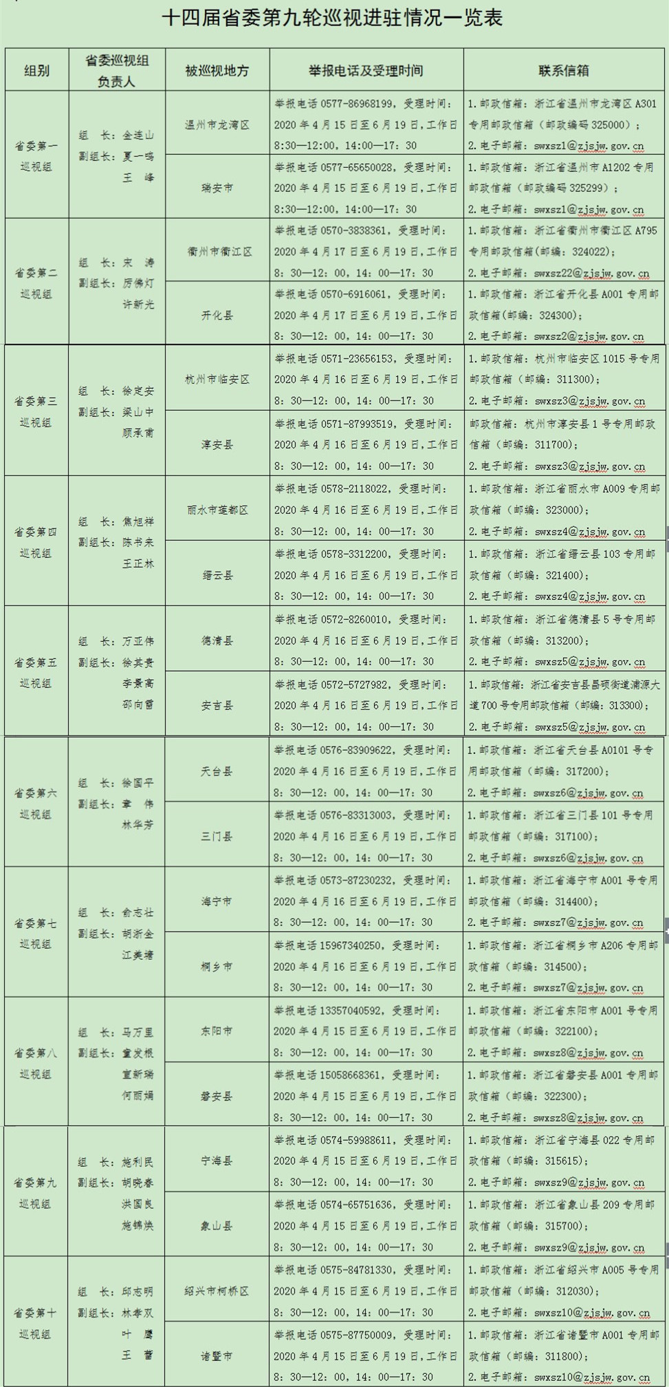 经省委批准,十四届省委第九轮巡视对杭州市临安区、淳安县、宁海县、象山县、温州市龙湾区、瑞安市、海宁市、桐乡市、德清县、安吉县、绍兴市柯桥区、诸暨市、东阳市、磐安县、衢州市衢江区、开化县、天台县、三门县、丽水市莲都区、缙云县等20个县(市、区)开展巡视。其中,对淳安县、磐安县、衢州市衢江区、开化县、天台县、三门县、丽水市莲都区、缙云县等8个县(区)同步开展省内扶贫开发专项监督。截至目前,10个省委巡视组全部进驻上述地方并召开动员会。