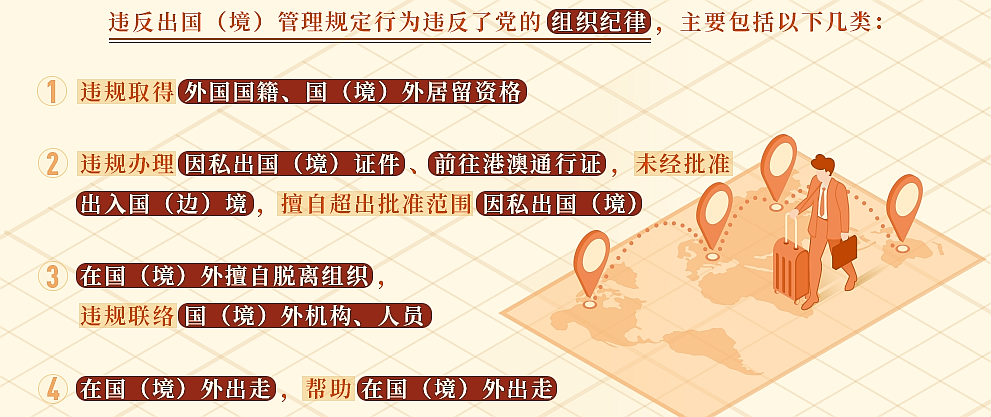 《中国共产党纪律处分条例》对违反出国(境)管理规定行为列出负面清单,作出处分规定。