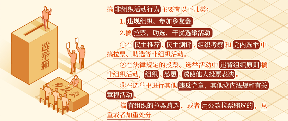 党内选举是党内政治生活的重要组成部分。《关于新形势下党内政治生活的若干准则》规定,党内选举必须体现选举人意志,坚决防止和查处拉票贿选等行为。在选举活动中搞非组织活动,干扰选举人表达选举意愿,侵犯其他被选举人权益,侵蚀党内政治文化,在党员群众中造成不良影响,对这类违反组织纪律的行为必须予以坚决惩治。
