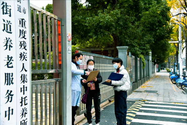 图为督察组检查养老院等重点机构人员进出防疫工作情况