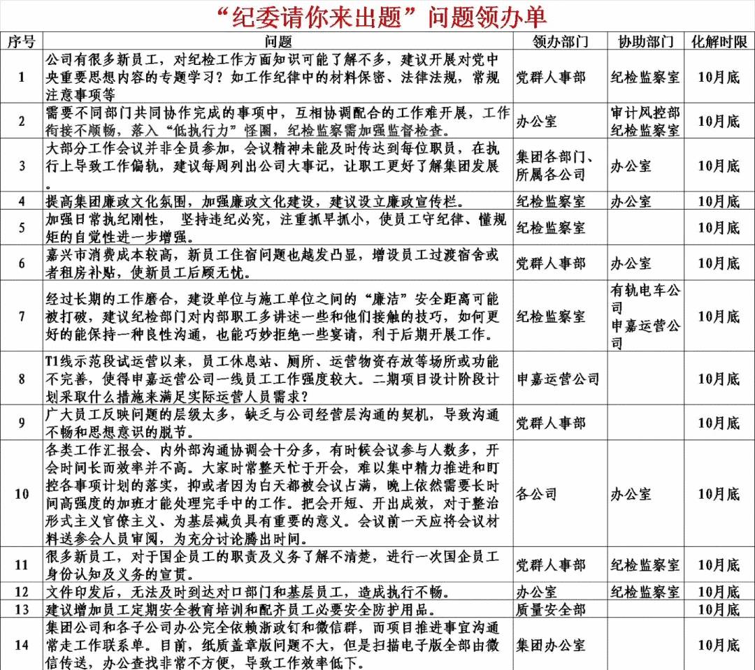 问题收集后,集团纪委将逐一梳理,交由集团相关部室和所属公司确认领办,并要求在15日拟定解决方案。从问题收集整理到落实解决,集团纪委全程跟踪督办。