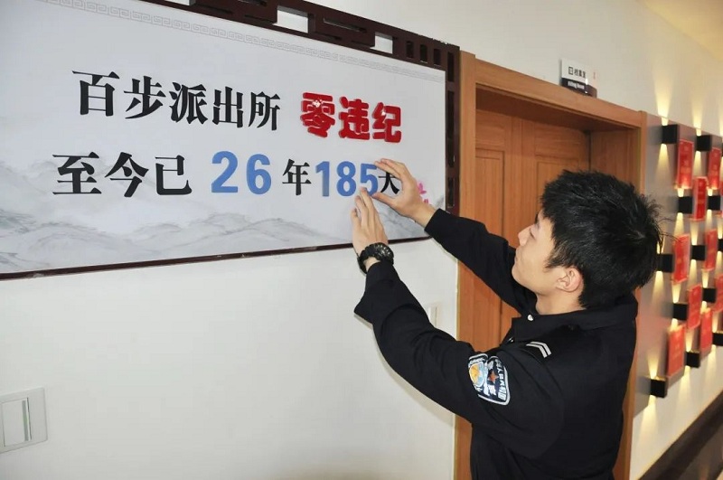 他下意识地望向对面墙上的清廉计时牌。这是百步派出所的一块特殊标记,上面写着“至今已26年185天”,数字代表派出所保持“零违纪”的时长。每天一早,更新计时牌内的数字,是所里民警必做的一件事。