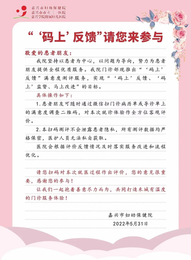 让患者津津乐道的“码”上反馈是今年5月嘉兴市妇幼保健院创新推出的门诊患者满意度调查新模式。从纸质问卷、电话短信调查,到如今进阶版的“码”上调查,数字化建设让医疗服务越来越有温度。