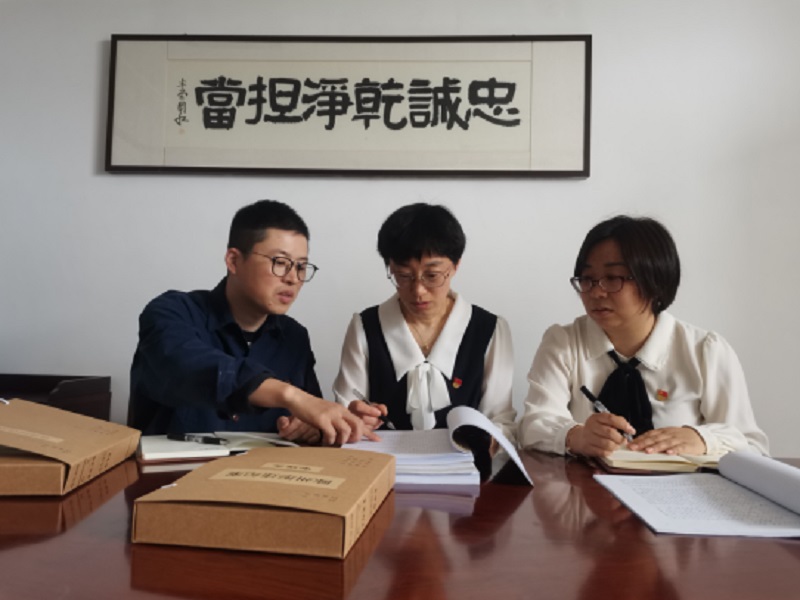 图为海盐县纪委监委审查组人员正在分析研讨陈州彤案件相关情况。海盐县纪委监委 马晓燕 摄