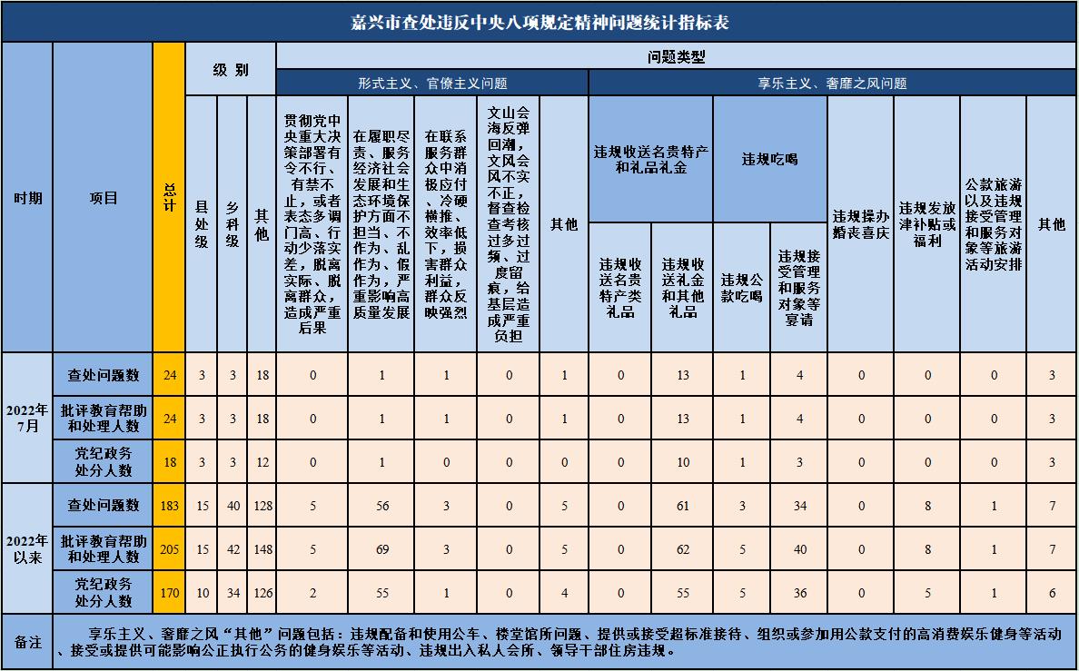 2022年7月,嘉兴市各级纪检监察机关共查处违反中央八项规定精神问题24起,批评教育帮助和处理24人,其中给予党纪政务处分18人。其中: