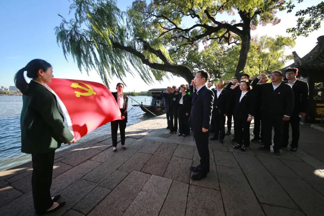 秀洲区纪委区监委开展学习宣传党的二十大精神暨新时代“重走一大路”活动。图为在秀洲区委常委、区纪委书记、区监委主任王志军的领誓下,区纪委区监委党员干部代表重温入党誓词。徐华隽 摄