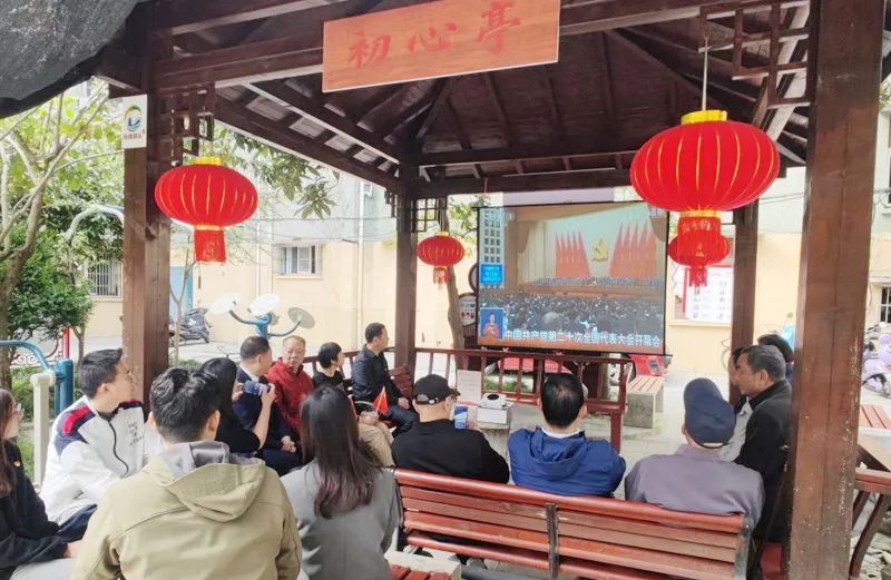 海宁市纪检监察干部在海洲街道白漾社区的初心亭内,与居民共同观看党的二十大开幕。