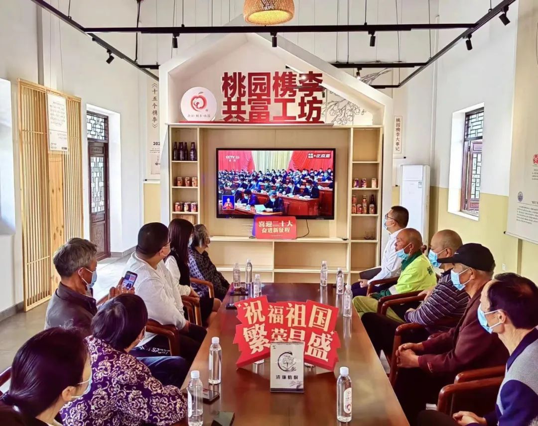 桐乡市梧桐街道纪检监察干部与桃园村槜李合作社的党员群众一同收看二十大开幕式。
